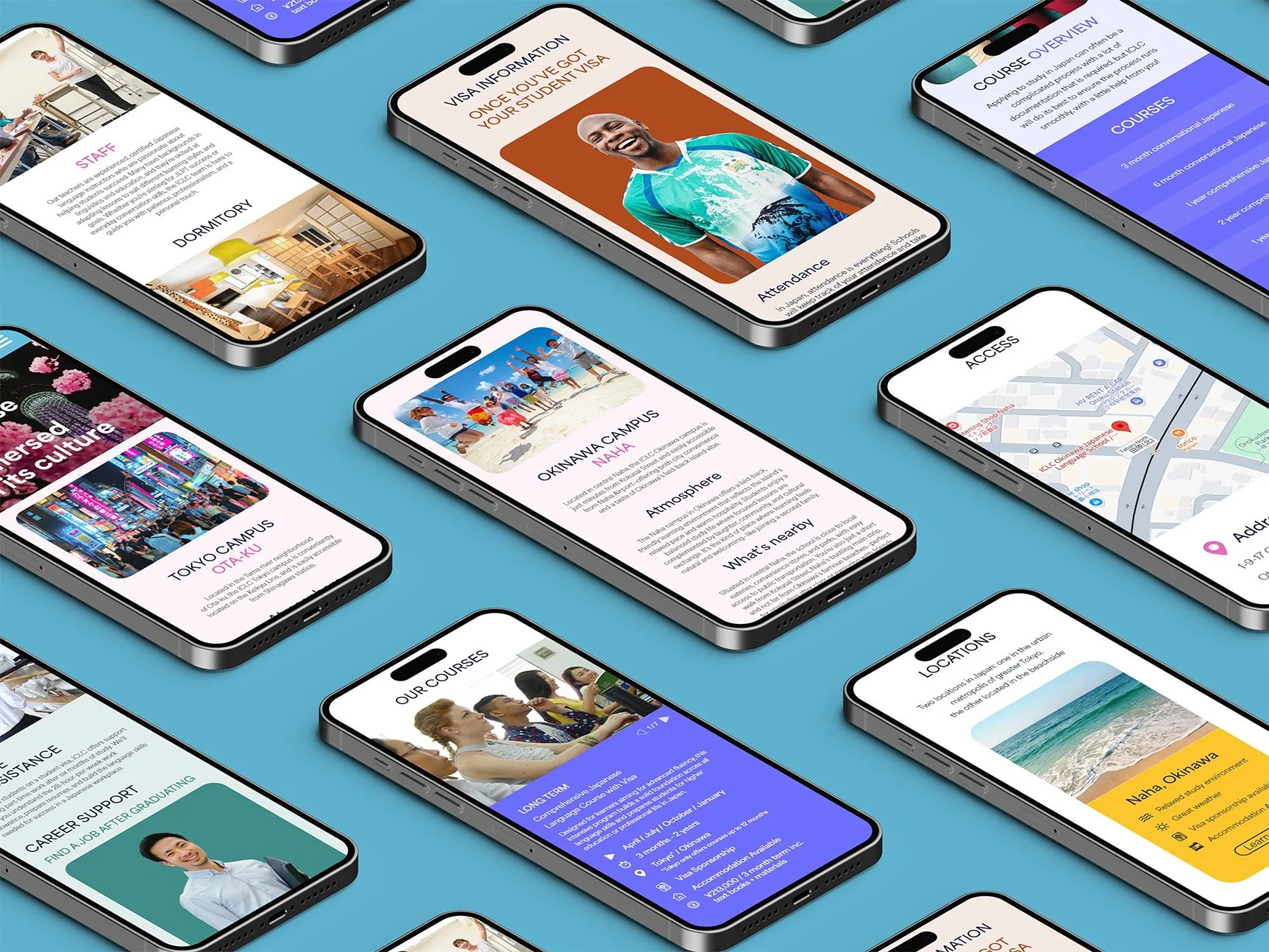 The design focused on brightness, colour, and a playful aesthetic, aligning with the school’s vibrant atmosphere while clearly presenting key details. Tokyo’s dynamic, fast-paced energy was reflected in the design, while Okinawa’s more relaxed, tropical setting was incorporated to highlight the contrasting environments of the two campuses.