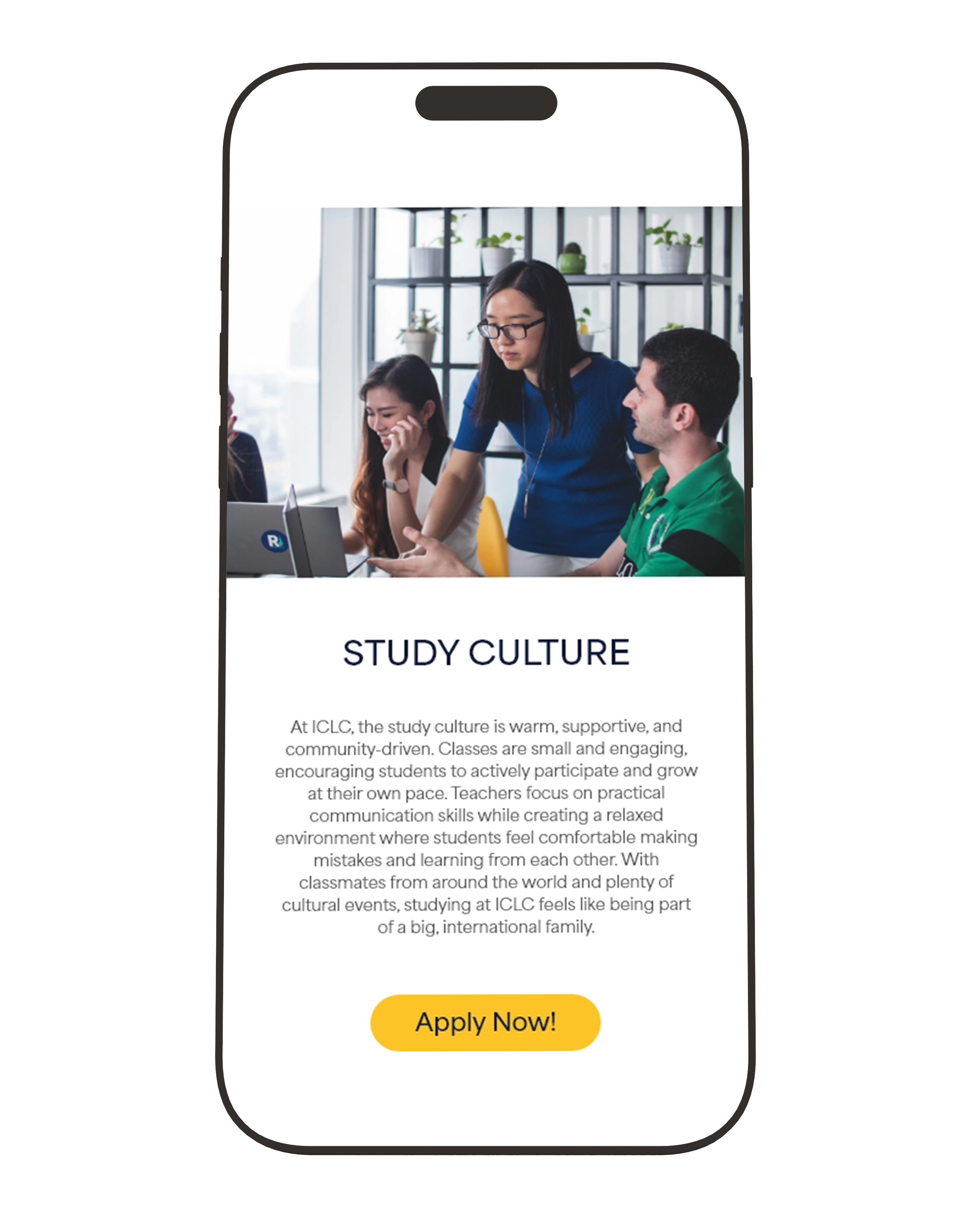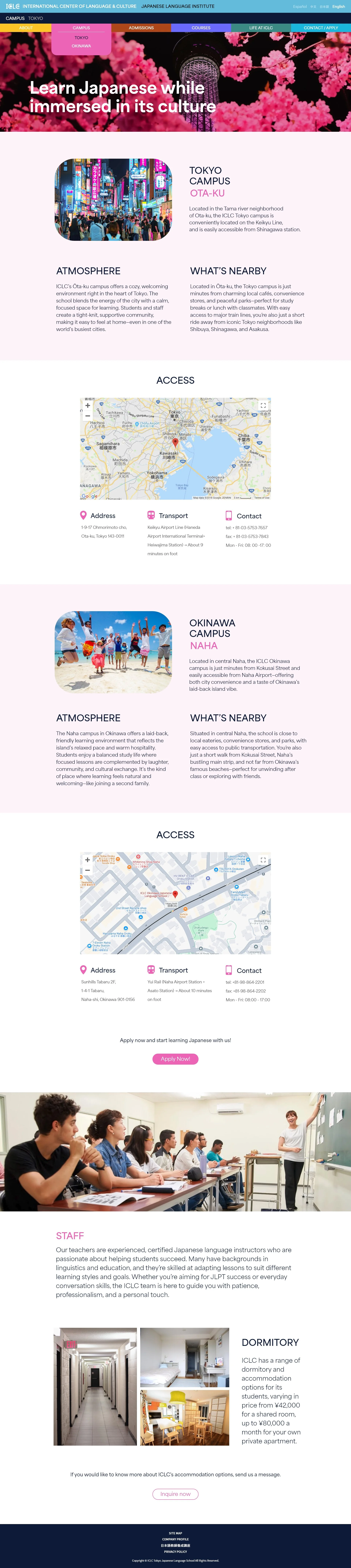 By combining clear, accessible copy with an engaging design, the site successfully conveyed the diverse experiences that ICLC offers. It appealed to prospective students eager to immerse themselves in the cultural vibrancy of Tokyo or enjoy the laid-back lifestyle of Okinawa, all while making essential information easy to find and digest.